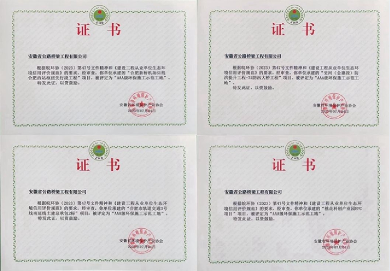 近日,公司承建的桃花科創(chuàng)產(chǎn)業(yè)園EPC項(xiàng)目、史河(金寨段)防洪提升工程-7#防汛大橋項(xiàng)目、合肥新橋機(jī)場S1線先行段項(xiàng)目、合肥軌道3號線南延2標(biāo)項(xiàng)目獲評安徽省環(huán)境保護(hù)產(chǎn)業(yè)協(xié)會“AAA級環(huán)保施工示范工地”稱號。