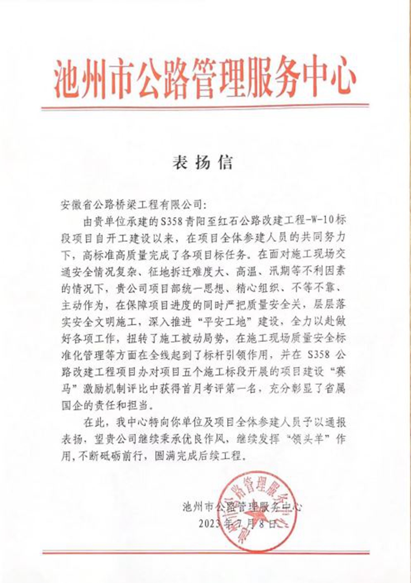 近日,公司收到池州市公路管理服務(wù)中心表?yè)P(yáng)信。