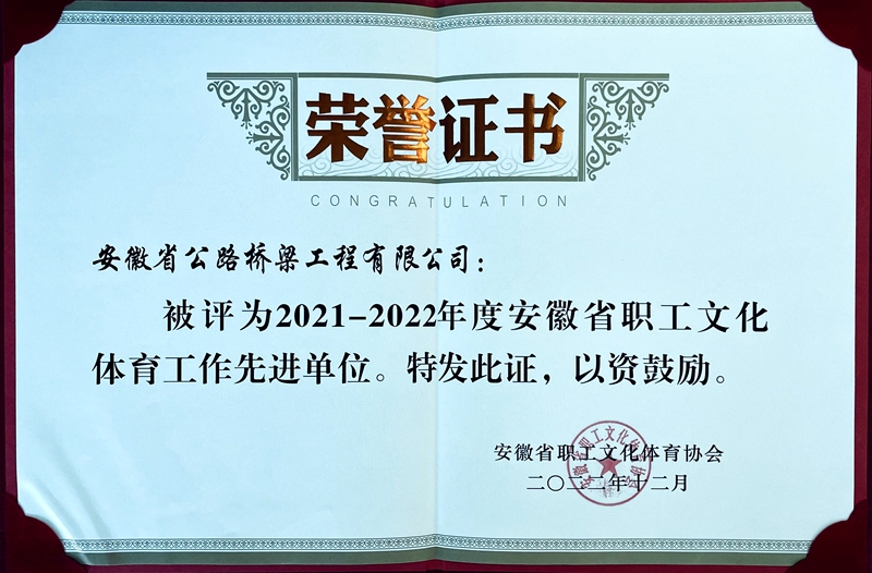 近日,安徽省職工文化體育協(xié)會發(fā)布了《關于表彰安徽省職工文化體育工作先進單位的通報》,授予安徽省公路橋梁工程有限公司等13家企事業(yè)單位“2021-2022年度安徽省職工文化體育工作先進單位”稱號。