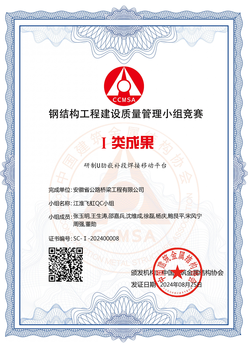 8月23日至25日,中國(guó)建筑金屬結(jié)構(gòu)協(xié)會(huì)在大同舉辦2024年鋼結(jié)構(gòu)工程建設(shè)質(zhì)量管理小組競(jìng)賽,公司《研制U肋嵌補(bǔ)段焊接移動(dòng)平臺(tái)》QC成果受到評(píng)審專家的一致好評(píng),榮獲Ⅰ類(lèi)成果,同時(shí)作為優(yōu)秀成果案例在表彰大會(huì)上作交流。