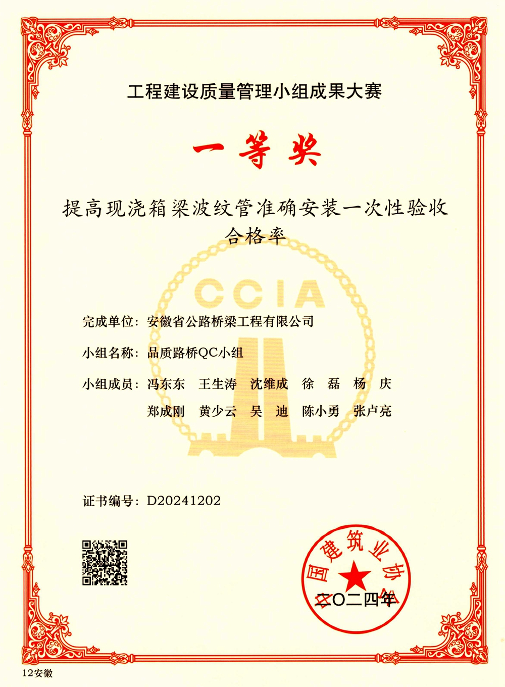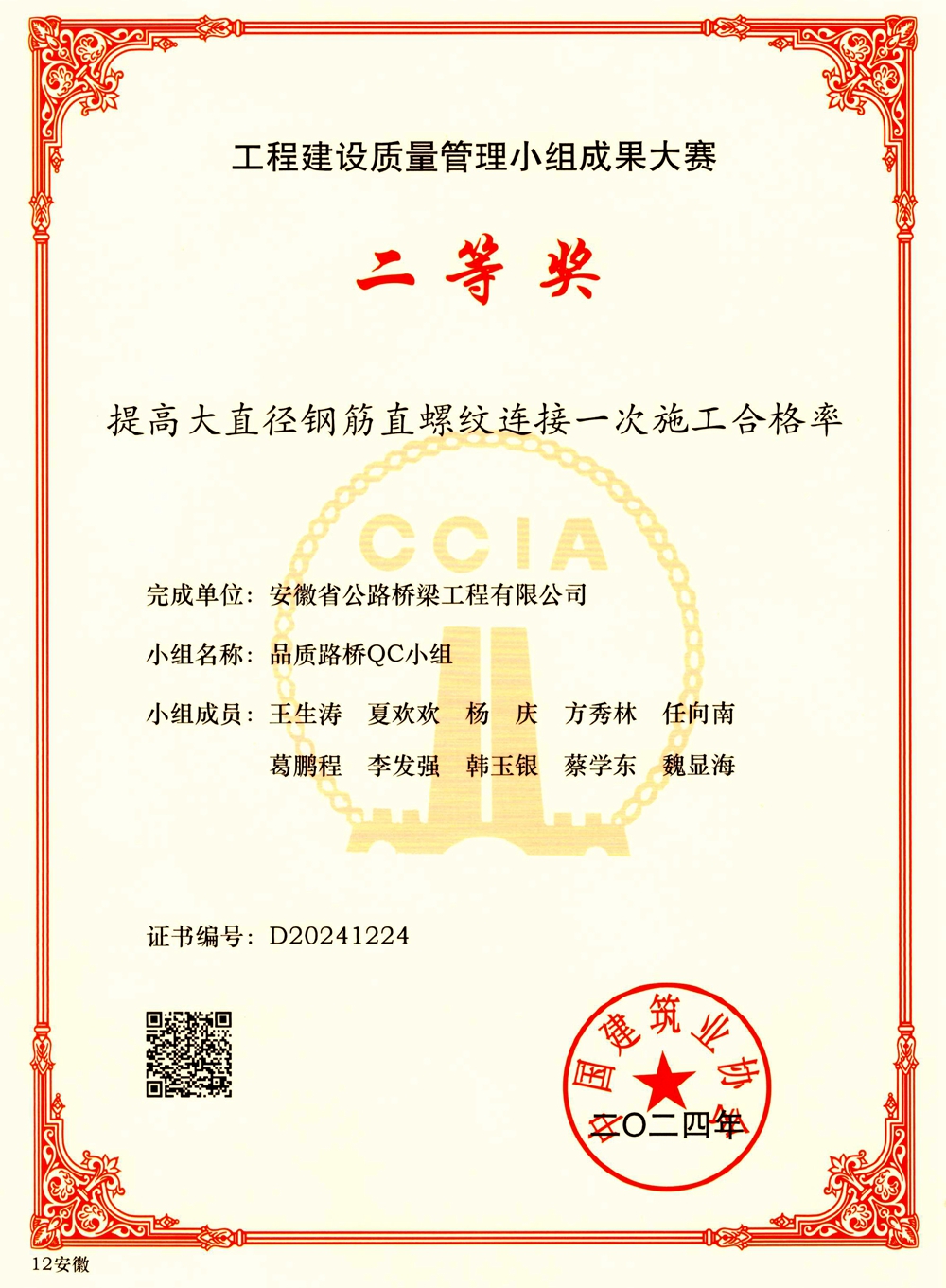 本次QC決賽共發(fā)布751項(xiàng)成果。公司推薦的《提高索導(dǎo)管定位安裝一次性驗(yàn)收合格率》《提高現(xiàn)澆箱梁波紋管準(zhǔn)確安裝一次性驗(yàn)收合格率》2項(xiàng)QC成果獲一等獎,《提高大直徑鋼筋直螺紋連接一次施工合格率》QC成果獲得二等獎。