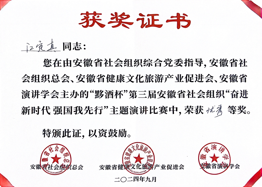 9月21日,第三屆安徽省社會組織“奮進新時代 強國我先行”主題演講比賽復賽、決賽在合肥舉行,公司選送參賽選手江定真參加角逐,經(jīng)過激烈比拼,榮獲優(yōu)秀獎。