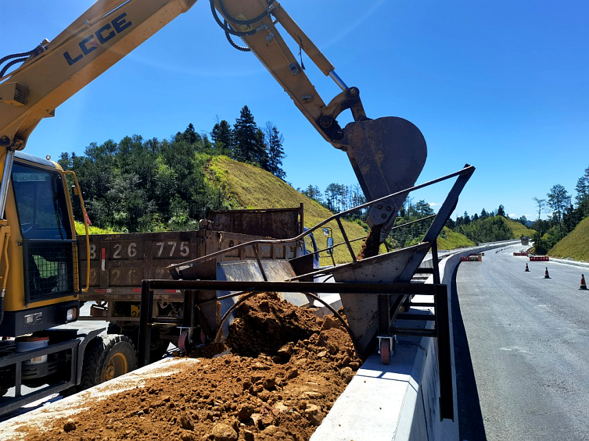 中分填土實(shí)現(xiàn)零污染。傳統(tǒng)高速公路中分帶培植用土施工,極易造成路面污染。為解決該難題,公司創(chuàng)新研發(fā)中分帶新澤西護(hù)欄間填土漏斗裝置,根據(jù)現(xiàn)場(chǎng)護(hù)欄尺寸、填土高度,制作填土漏斗,填土施工通過(guò)漏斗槽滑入護(hù)欄內(nèi)部,避免外溢,同時(shí)漏斗可以在護(hù)欄頂部和側(cè)面自由滑動(dòng),實(shí)現(xiàn)中分帶填土零污染施工,有效保證路面清潔施工,較傳統(tǒng)工藝施工效率提高50%左右。