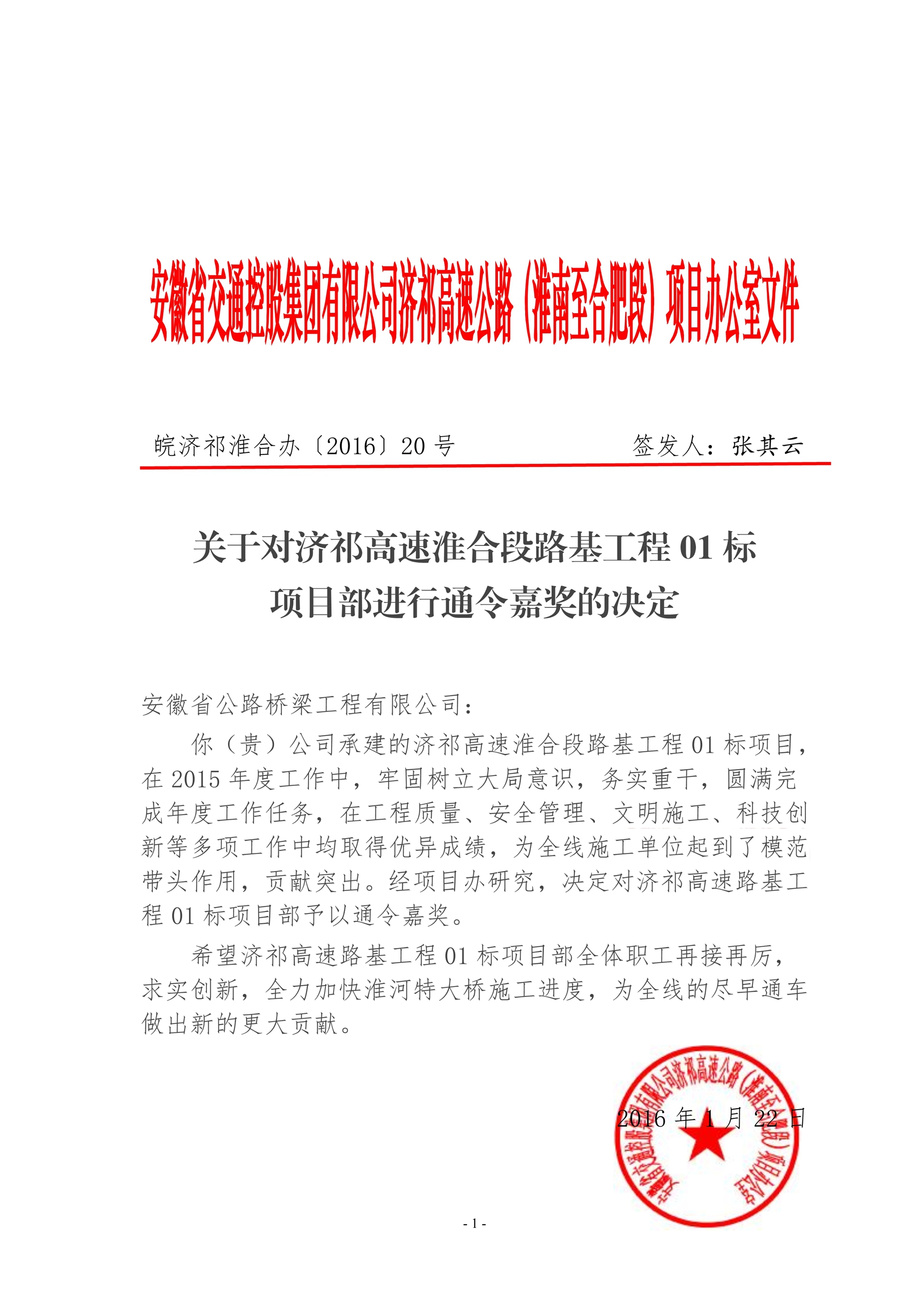 1月22日,安徽省交通控股集團發(fā)來嘉獎令,對公司承建的濟祁高速淮合段路基工程01 標(biāo)項目通令嘉獎。