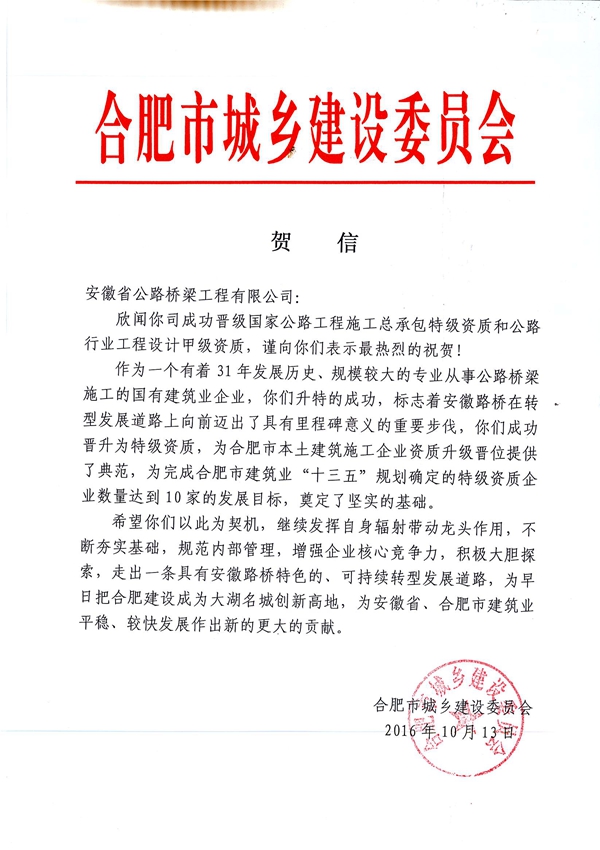 近日,合肥市城鄉(xiāng)建設(shè)委員會向公司發(fā)來賀信,熱烈祝賀公司晉升國家公路工程施工總承包特級資質(zhì)和公路行業(yè)工程設(shè)計甲級資質(zhì)。